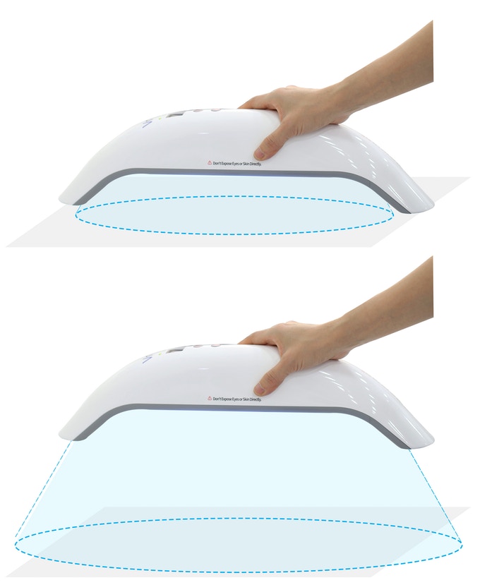 2. Portable mode ด้วยมือเดียวจับ ก็สะดวกและสะอาดเช่นกัน (แนะนำไม่เกิน 20 cm จากตัววัตถุ ใช้เวลา 10 วินาที) = พื้นที่ฆ่าเชื้อ เส้นผ่าศูนย์กลาง 80 cm